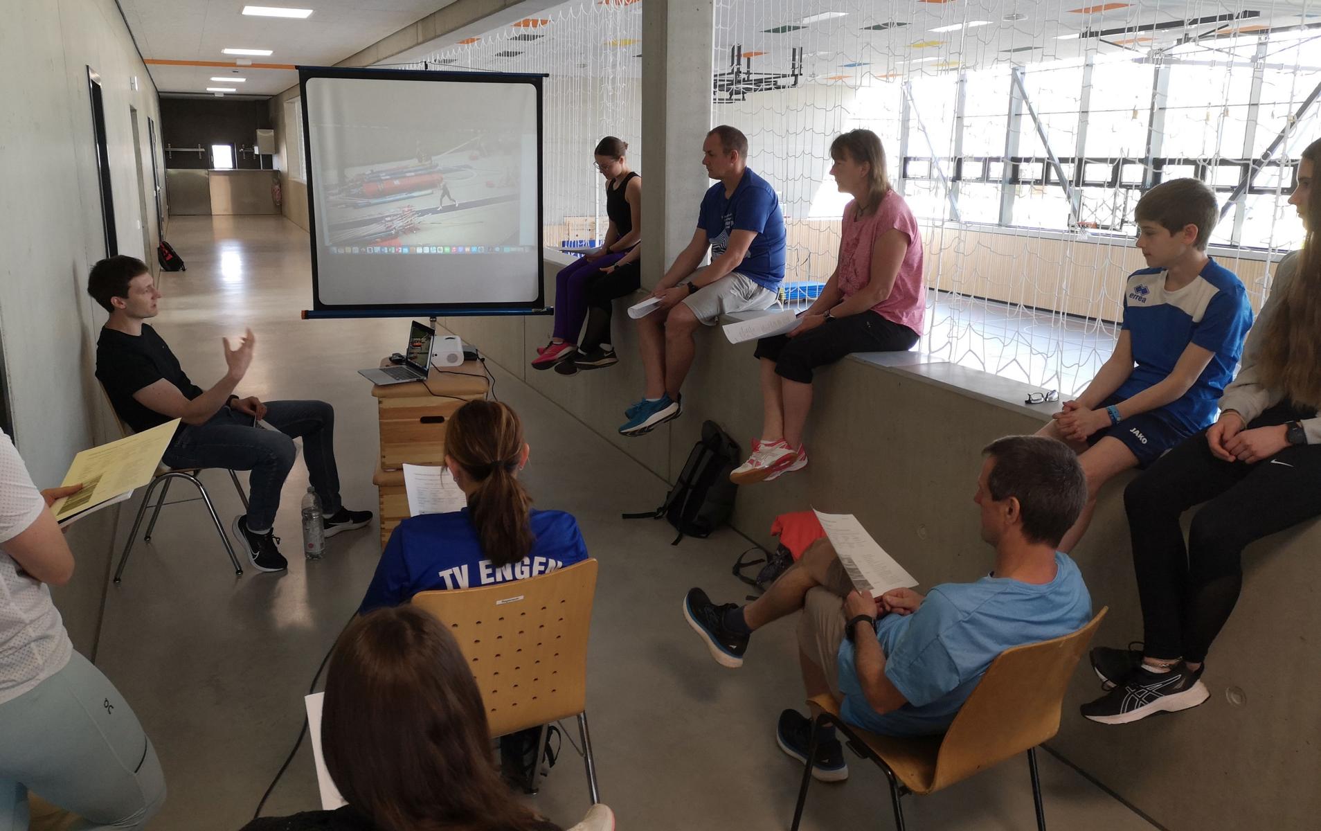 Angesprochen wurden Übungsvarianten, wie man auch ohne spezielle Matte in einer Übungsgruppe mit dem Stab springen kann. Es wurden Vorübungen in vielfältiger Weise zum Stabtransport und der Stabhandhabung demonstriert, die Abläufe bis zum Stabeinstich gezeigt und schließlich an der Matte vom Absprung am starren Stab bis zur Landung die wesentlichen Elemente und Übungsschritte mit Hilfe der Athlet:innen demonstriert. Stephan Munz erklärte dabei, was und wie korrigiert wird und gab weitere Tipps zu Übungen und Variationsformen.