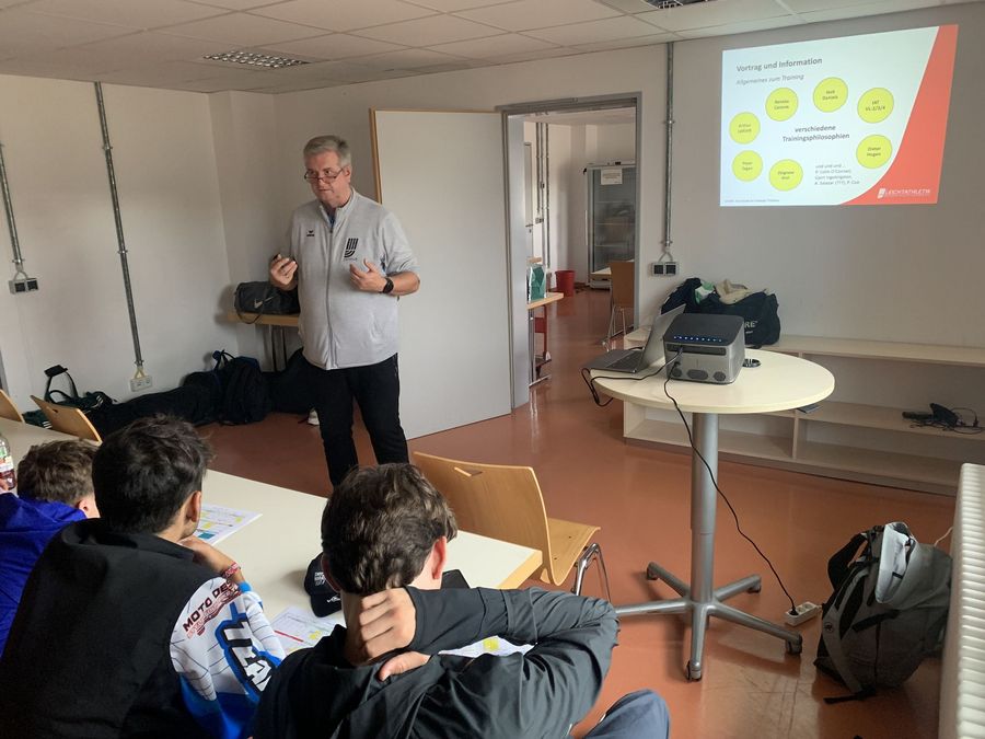 Nach dem Mittagessen im Restaurant Neckarpark versammelten sich die U20- und U23-Athleten im Besprechungsraum. Die beiden Landestrainer Jens Boyde und Christoph Thürkow gaben einen kurzen Überblick über die verschiedenen Trainingsphilosophien im Laufbereich und erläuterten den Weg des Laufteams innerhalb der Leichtathletik Baden-Württemberg für die kommenden Trainingswochen. Mit dem Herbsttrainingslager vom 30. Oktober bis 5. November in Freudenstadt sowie den daran anschließenden Crossläufen stehen bald die nächsten Maßnahmen und Wettkämpfe für die Ausdauerathleten an.