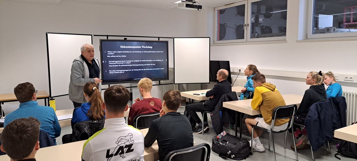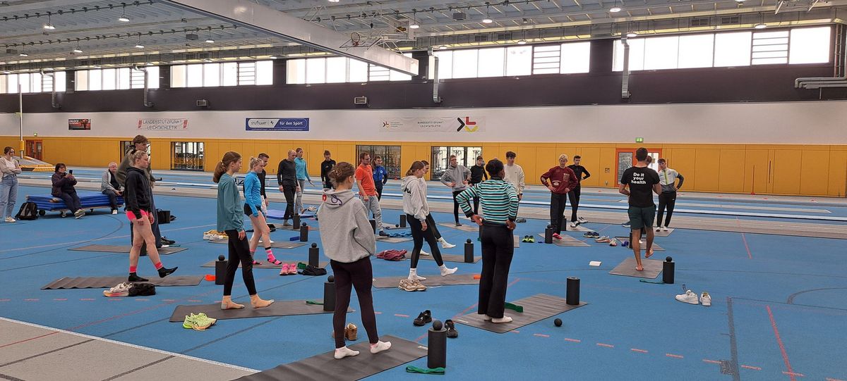 Nach einer kleinen Mittagspause ging es für die meisten Athlet:innen sowie einigen Heimtrainer:innen in der Molly-Schauffele-Halle weiter. In einem gemischten Workshop aus theoretischen und praktischen Inhalten ging es um wesentliche Mittel der Verletzungsprophylaxe durch Faszientraining. Erst erläuterte Prof. Dr. Stefan Grau von der Universität Tübingen im Seminarraum den wissenschaftlichen Hintergrund; anschließend demonstrierte Stefan Schneider von der Firma BlackRoll in einem ca. 30-minütigen Programm in der Sporthalle, wie die Faszien richtig ausgerollt und gedehnt werden.
