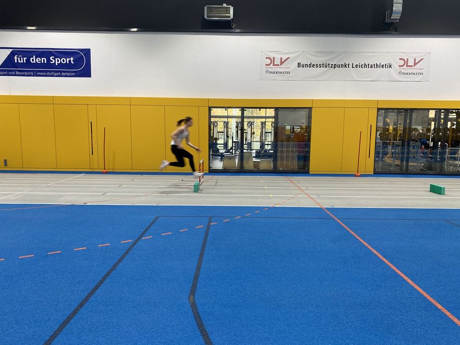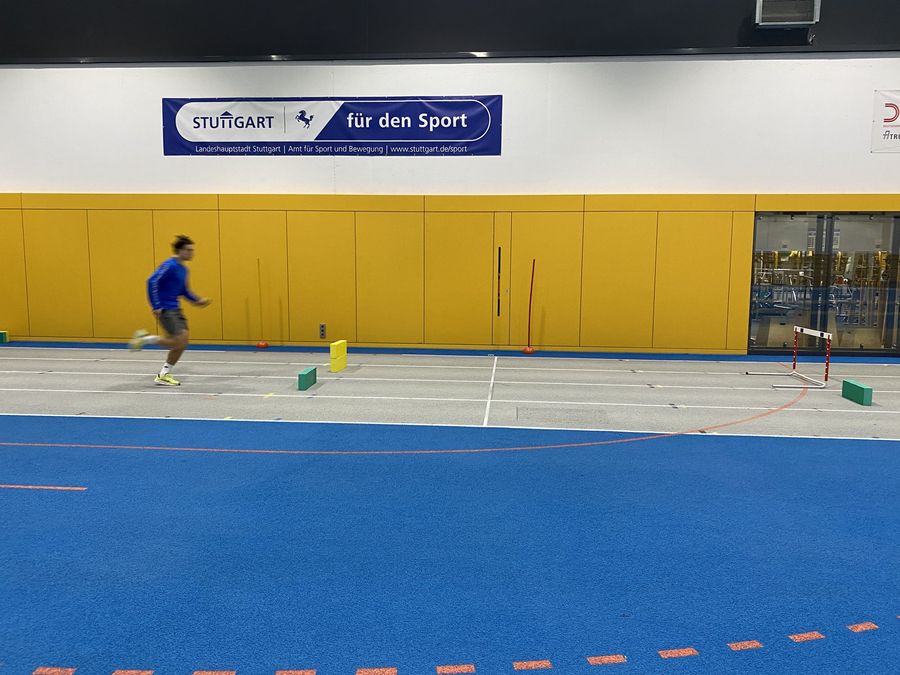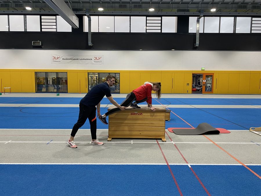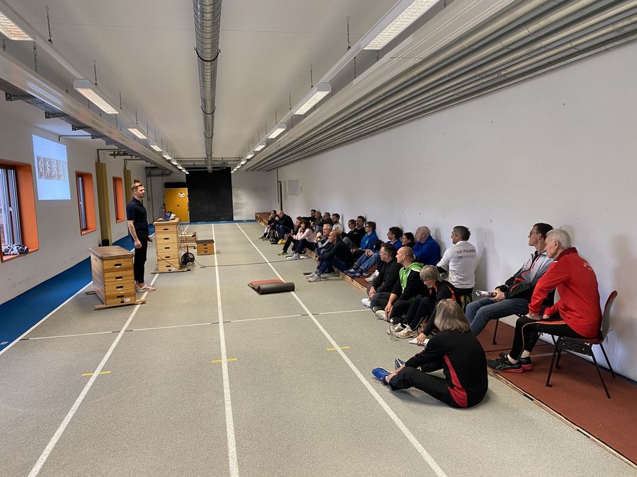 Eric Lehmann rückte die Geschwindigkeitsentwicklung im Sprint in den Mittelpunkt seines Workshops. Der Trainingswissenschaftler des Olympiastützpunktes Stuttgart zeigte anhand der Formel „Geschwindigkeit = Frequenz x Schrittlänge“ auf, welche Komponenten im Sprint leistungsentscheidend sind. Punkte wie beispielsweise die Optimierung der Gesamtkörpervorlage sowie die Veränderung der Wege der Teilkörper im Bereich des Fußes, des Knies und der Hüfte wurden zunächst in intensiven Videoanalysen aufgezeigt. Anschließende Kraftübungen in der Praxis unterstützten die Trainer:innen in der Entwicklung dieser elementarer Bewegungsmuster.