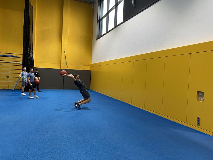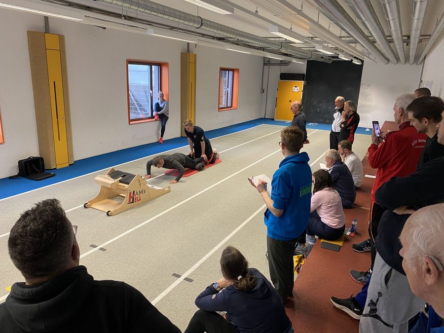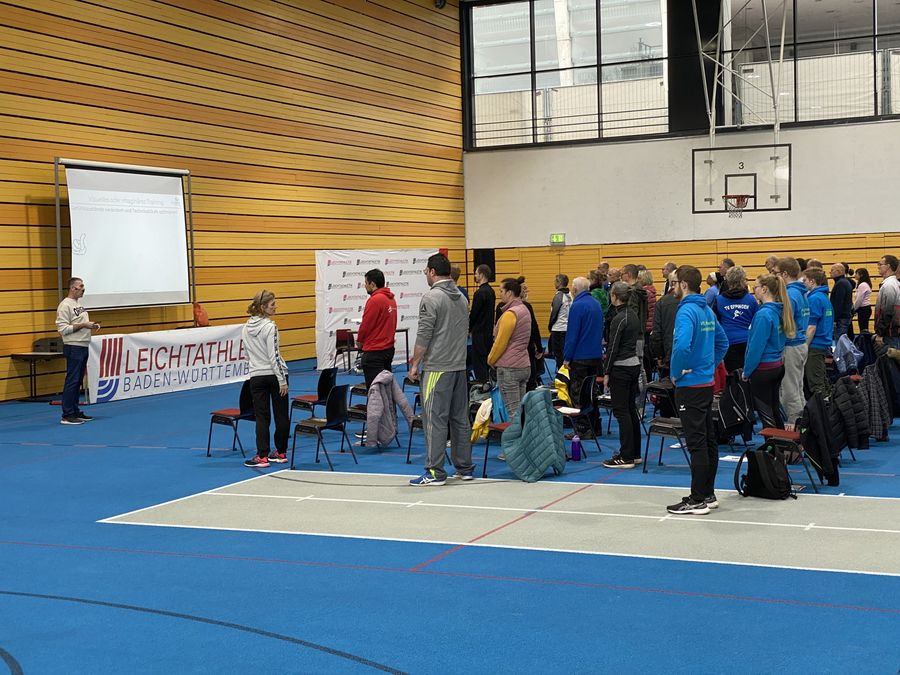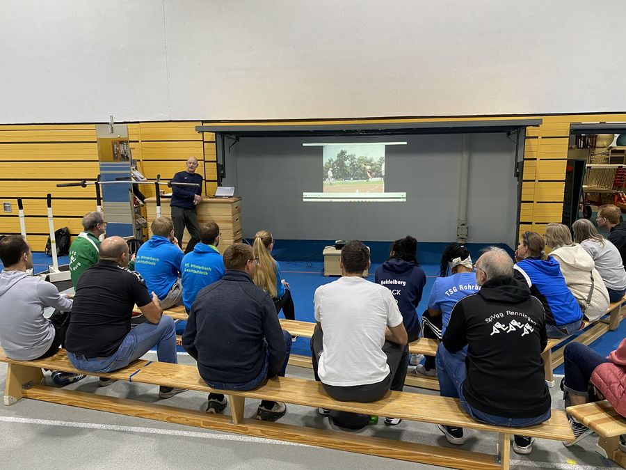 Prall gefüllt mit knapp 20 Trainer:innen war der Workshop zum Speerwurf von Bundesstützpunkttrainer Lutz Klemm. Mit dem Fokus Stabilität und Gleichgewicht zeigt er anhand der mehrjährigen Entwicklung seiner Top-Speerwerfer wie beispielsweise Andreas Hofmann (MTG Mannheim), worauf im Techniktraining zu achten ist. In der anschließenden Praxisdemonstration war Andreas Hofmann sogar auch vor Ort und demonstrierte gemeinsam mit Nick Thumm (LAV Stadtwerke Tübingen) und Julian Fundel (LG Eningen-Reutlingen) zahlreiche Grundlagenübungen von Speerläufen über Medizinballwürfen hinzu Würfen und Stößen mit der Kugel.